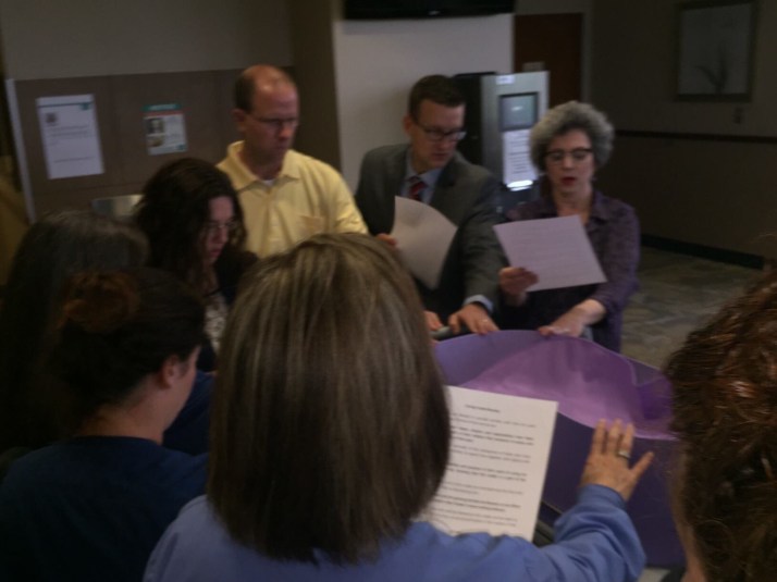 Kyleigh’s parents, Foundation staff, Birthing Center staff and hospital chaplain, Rev. Dr. Carmen Lile-Henley, joined together to dedicate the Caring Cradle. Rev. Lile-Henley wrote a responsive reading and everyone placed hands on the Caring Cradle during the blessing.