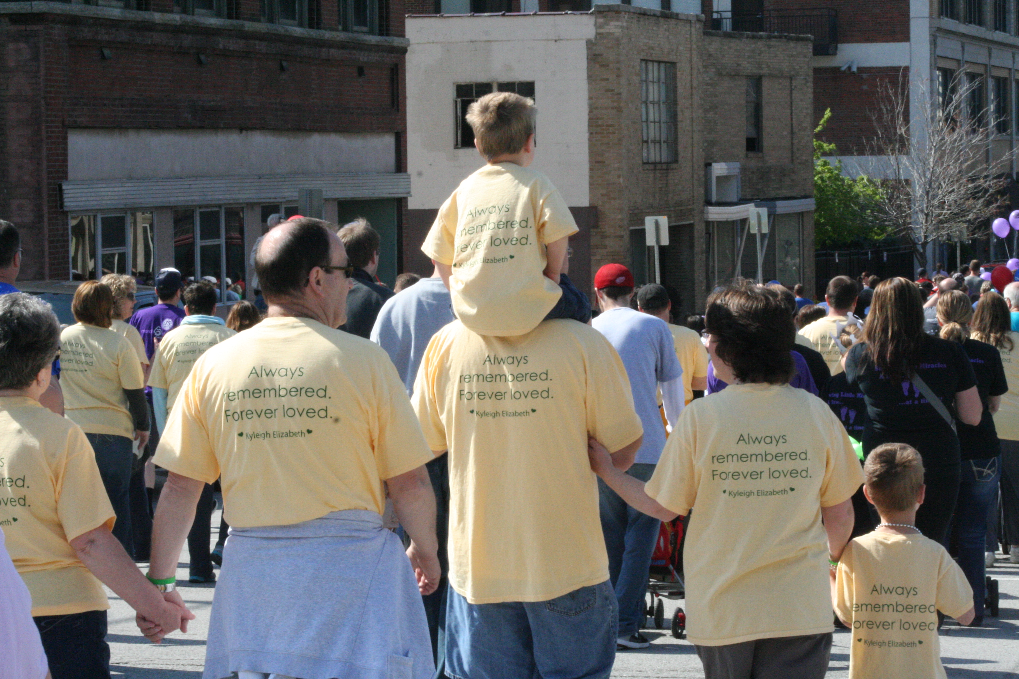On Sunday, April 28, 2013, thirty of our family and friends joined us to March for Babies in memory of Kyleigh. Our team, Kyleigh’s Gift, raised $1660 for the March of Dimes! The weather was beautiful and we could not have asked for a greater turn out of support from everyone … walkers and those who donated money. A friend designed a t-shirt specific to our team and everyone proudly wore their Kyleigh’s Gift shirts at the walk. It was fun to look around and see that our team was the only one with yellow shirts! Walking the one mile route was definitely a bittersweet moment, one we would not have experienced if Kyleigh were with us today. Overall, it was a wonderful experience and we are grateful that we got to share it with so many people who love Kyleigh!